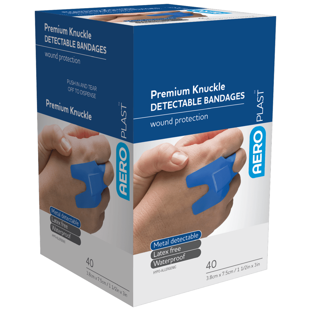 The AeroPlast Premium Detectable plaster is a premium latex-free, waterproof, hypo-allergenic, visual and metal detectable plaster specifically designed for the food manufacturing and processing sector. The Knuckle plaster is designed to conform to the shape of the knuckle so to form a secure and protective barrier to foreign particles while the AeroPlast Premium film ensures that the plaster moves, stretches and bends as the joint moves. The AeroPlast Premium Detectable plasters offer superior flexibility and adhesion when compared to conventional plastic plasters which is why they are the trusted plaster in the food processing and manufacturing industry.