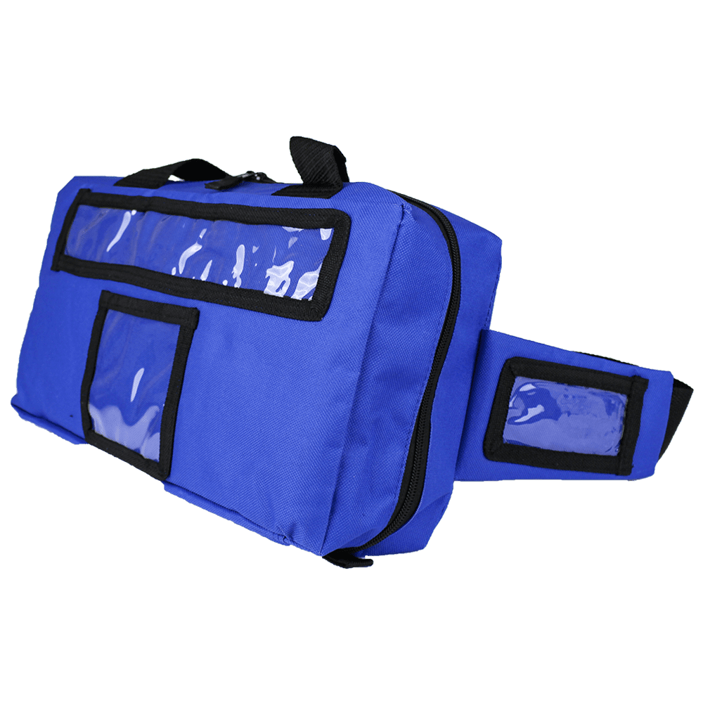 A large sized compact first aid bag with 5 clear insert pouches externally with sturdy carry handles and a waist strap. Inside there are multiple pocket, mesh pockets, clear pouches, Velcro loops and a fold out insert. Also available in red (ABLR01), or green with screen-printed signage (GB005).